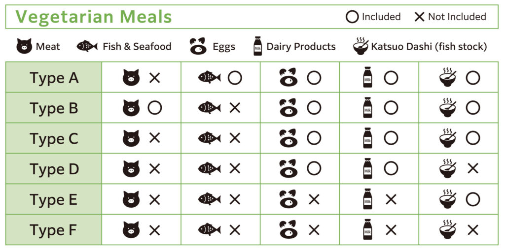 Vegetarianism is not common in the Japanese countryside. Please double-check the Vegetarian Type which the service provider can accommodate to make sure that it meets your needs. Katsuo Dashi (fish broth) is used for many types of seasoning and is very difficult to remove from traditional Japanese cooking. Often being able to eat trace amounts of the ubiquitous Katsuo Dashi (fish stock) makes it easier to find options.